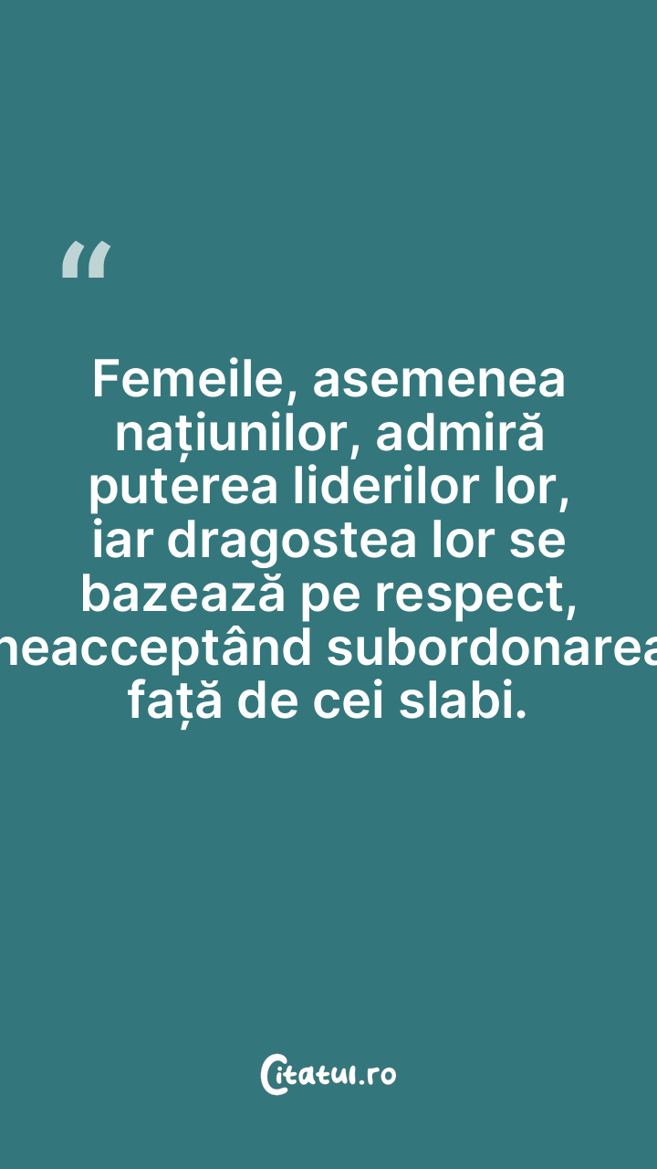 Femeile, asemenea națiunilor, admiră puterea liderilor lor, iar dragostea lor se bazează pe respect, neacceptând subordonarea față de cei slabi.