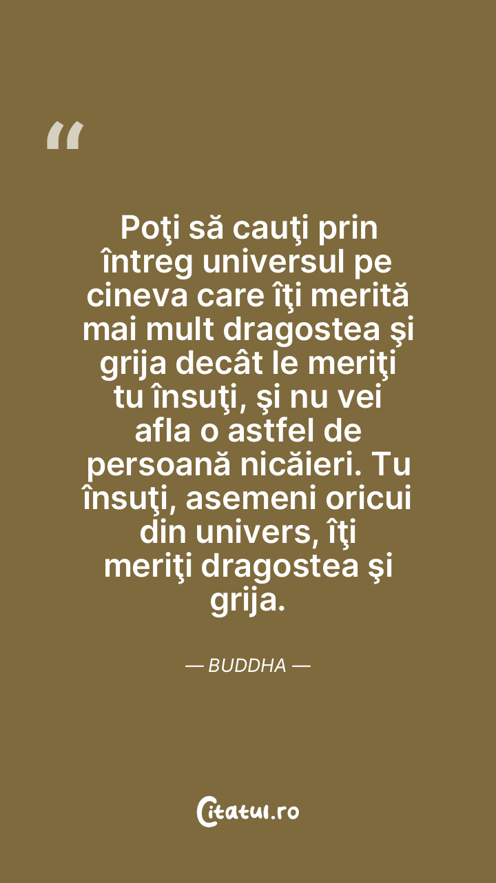 Poţi să cauţi prin întreg universul pe cineva care îţi merită mai mult dragostea şi grija decât le meriţi tu însuţi, şi nu vei afla o astfel de persoană nicăieri. Tu însuţi, asemeni oricui din univers, îţi meriţi dragostea şi grija. Buddha