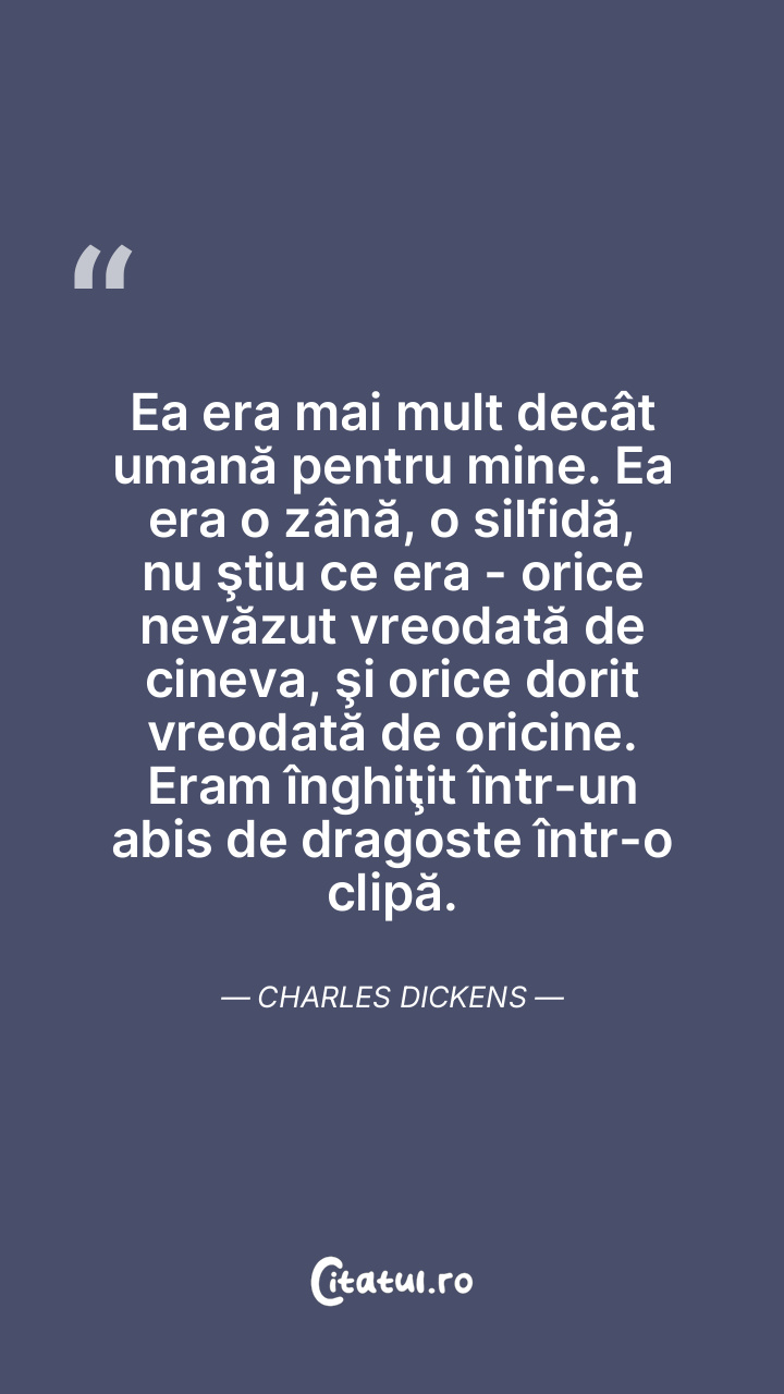 Ea era mai mult decât umană pentru mine. Ea era o zână, o silfidă, nu ştiu ce era - orice nevăzut vreodată de cineva, şi orice dorit vreodată de oricine. Eram înghiţit într-un abis de dragoste într-o clipă. Charles Dickens