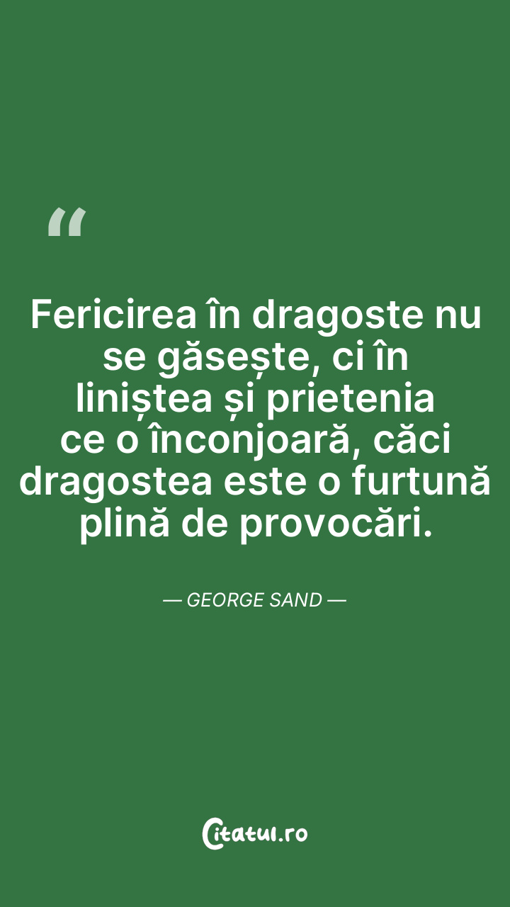 Fericirea în dragoste nu se găsește, ci în liniștea și prietenia ce o înconjoară, căci dragostea este o furtună plină de provocări. George Sand