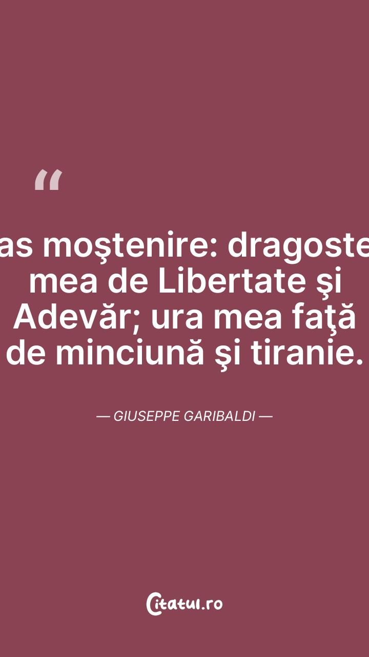 Las moştenire: dragostea mea de Libertate şi Adevăr; ura mea faţă de minciună şi tiranie. Giuseppe Garibaldi