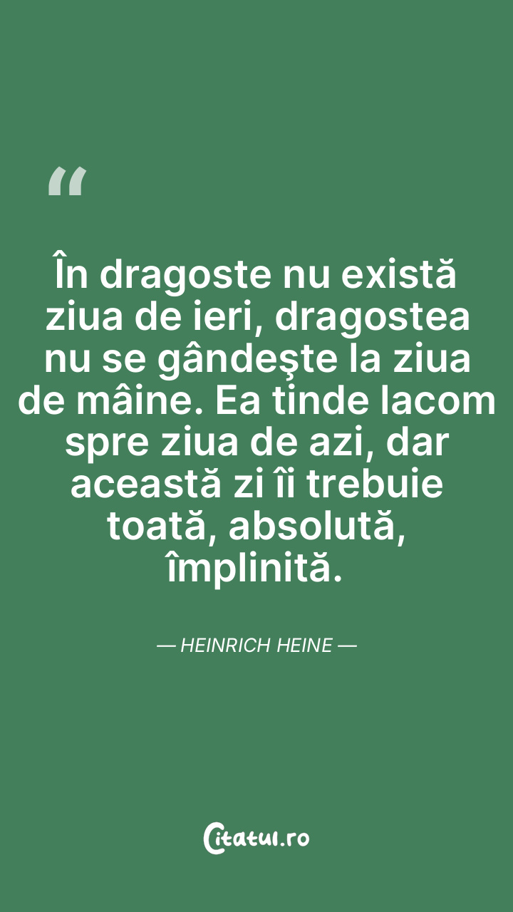 În dragoste nu există ziua de ieri, dragostea nu se gândeşte la ziua de mâine. Ea tinde lacom spre ziua de azi, dar această zi îi trebuie toată, absolută, împlinită. Heinrich Heine