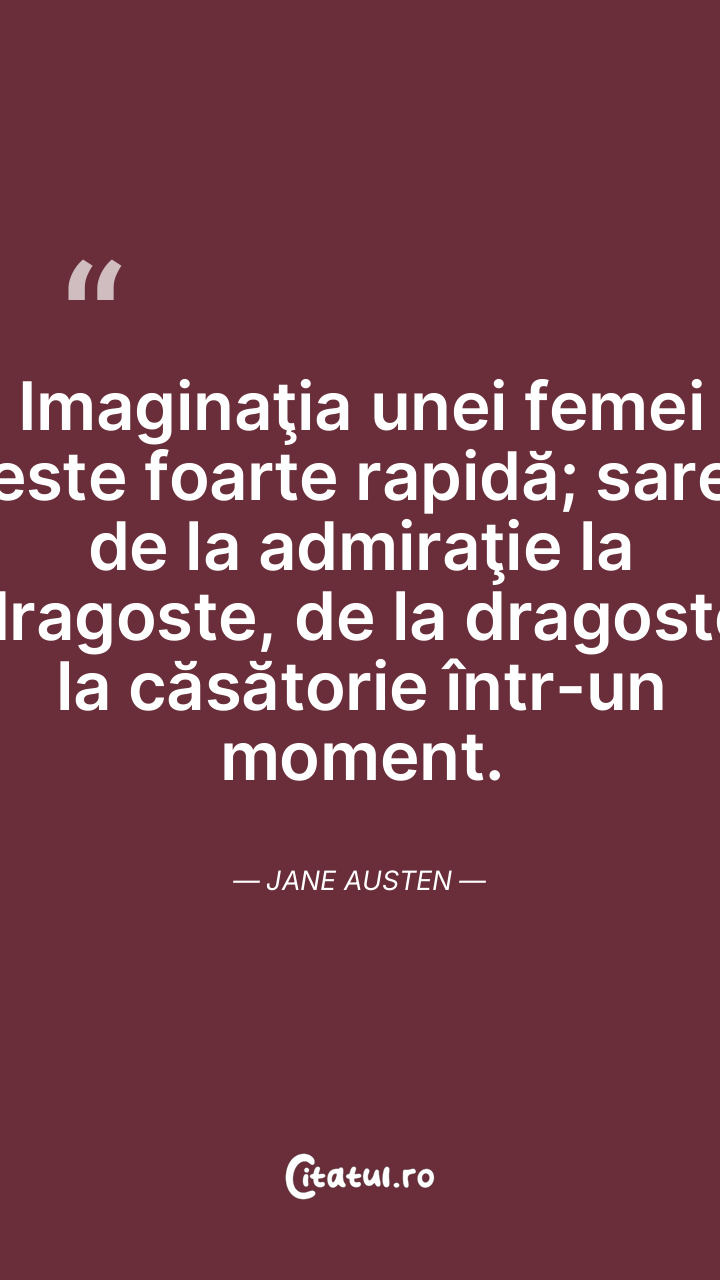 Imaginaţia unei femei este foarte rapidă; sare de la admiraţie la dragoste, de la dragoste la căsătorie într-un moment. Jane Austen