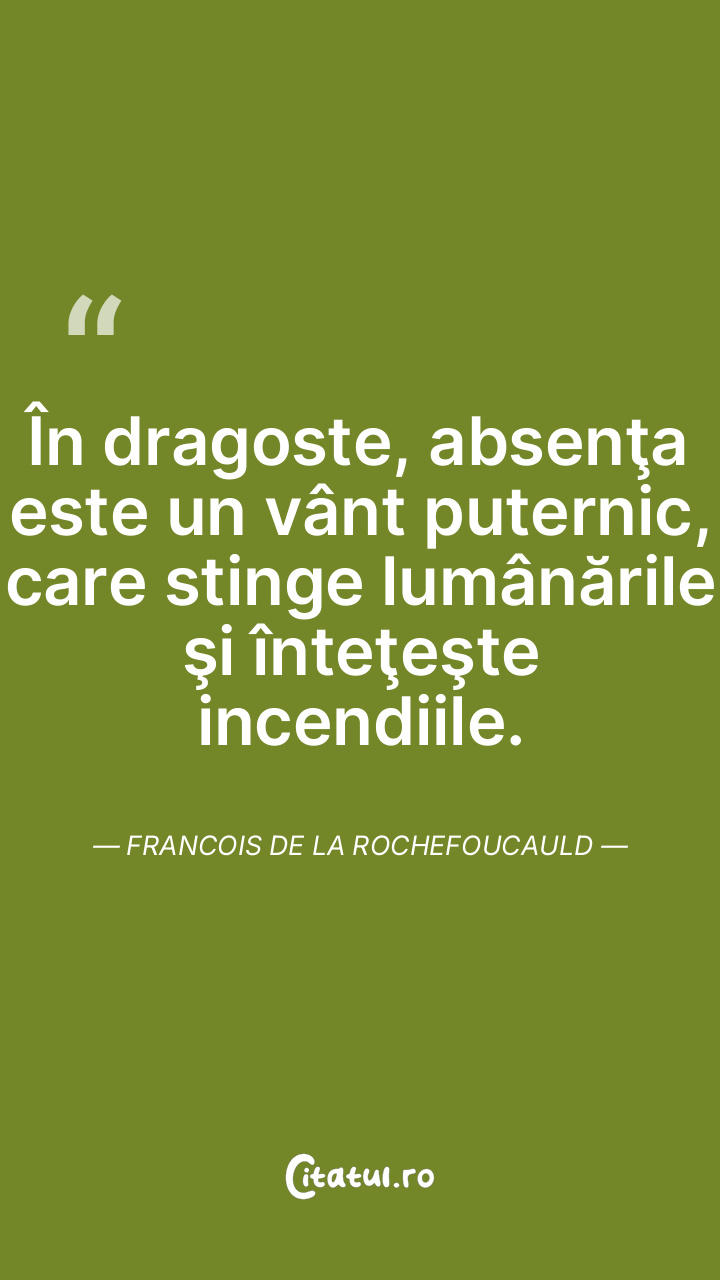 În dragoste, absenţa este un vânt puternic, care stinge lumânările şi înteţeşte incendiile. Francois de la Rochefoucauld