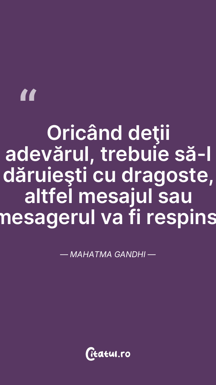 Oricând deţii adevărul, trebuie să-l dăruieşti cu dragoste, altfel mesajul sau mesagerul va fi respins. Mahatma Gandhi