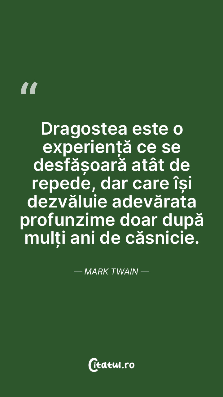 Dragostea este o experiență ce se desfășoară atât de repede, dar care își dezvăluie adevărata profunzime doar după mulți ani de căsnicie. Mark Twain