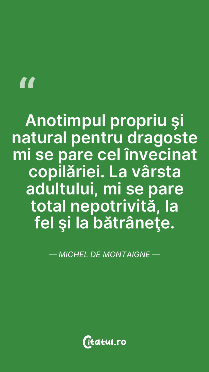 Anotimpul propriu şi natural pentru dragoste mi se pare cel învecinat copilăriei. La vârsta adultului, mi se pare total nepotrivită, la fel şi la bătrâneţe. Michel de Montaigne