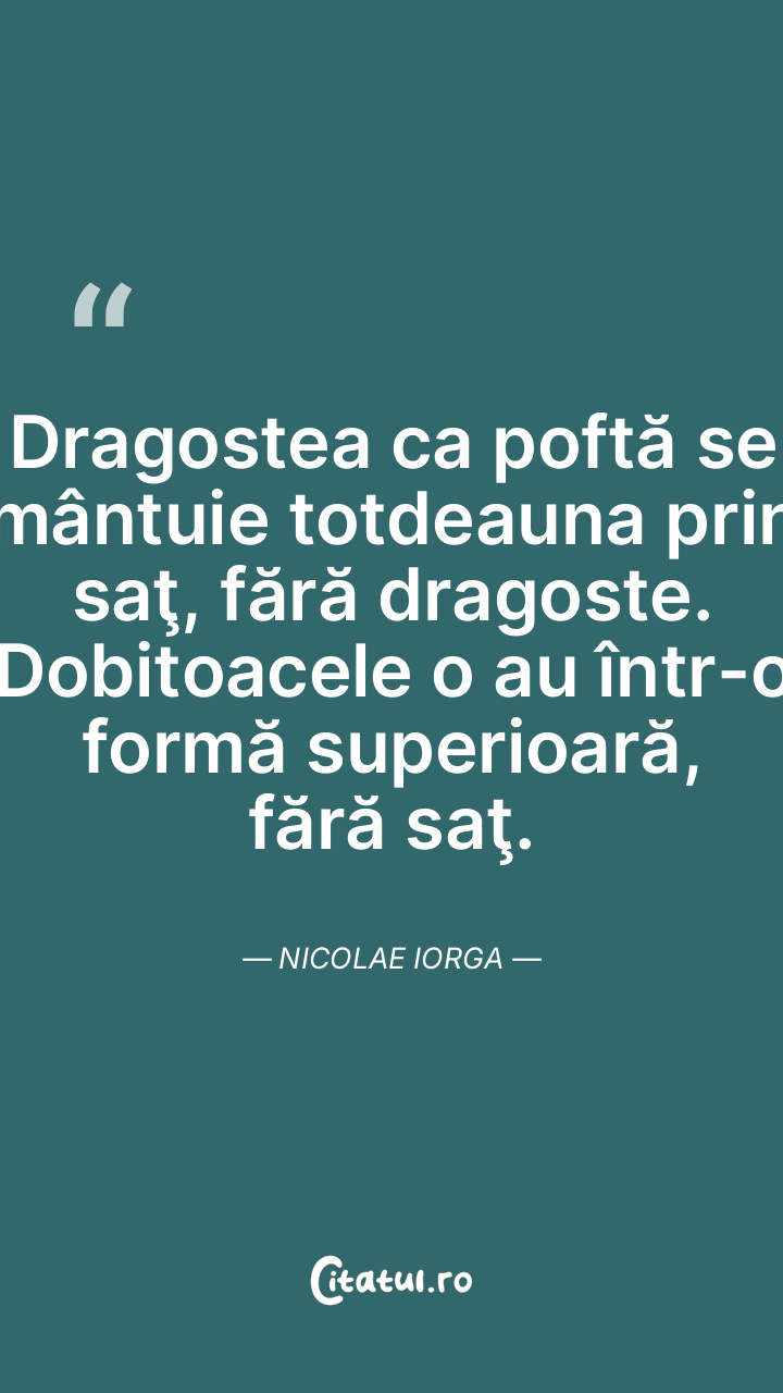 Dragostea ca poftă se mântuie totdeauna prin saţ, fără dragoste. Dobitoacele o au într-o formă superioară, fără saţ. Nicolae Iorga
