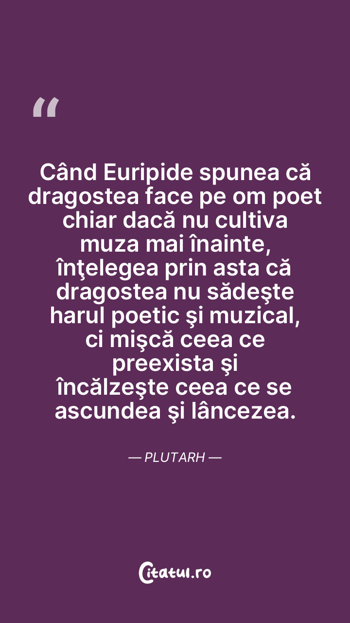 Când Euripide spunea că dragostea face pe om poet chiar dacă nu cultiva muza mai înainte, înţelegea prin asta că dragostea nu sădeşte harul poetic şi muzical, ci mişcă ceea ce preexista şi încălzeşte ceea ce se ascundea şi lâncezea. Plutarh