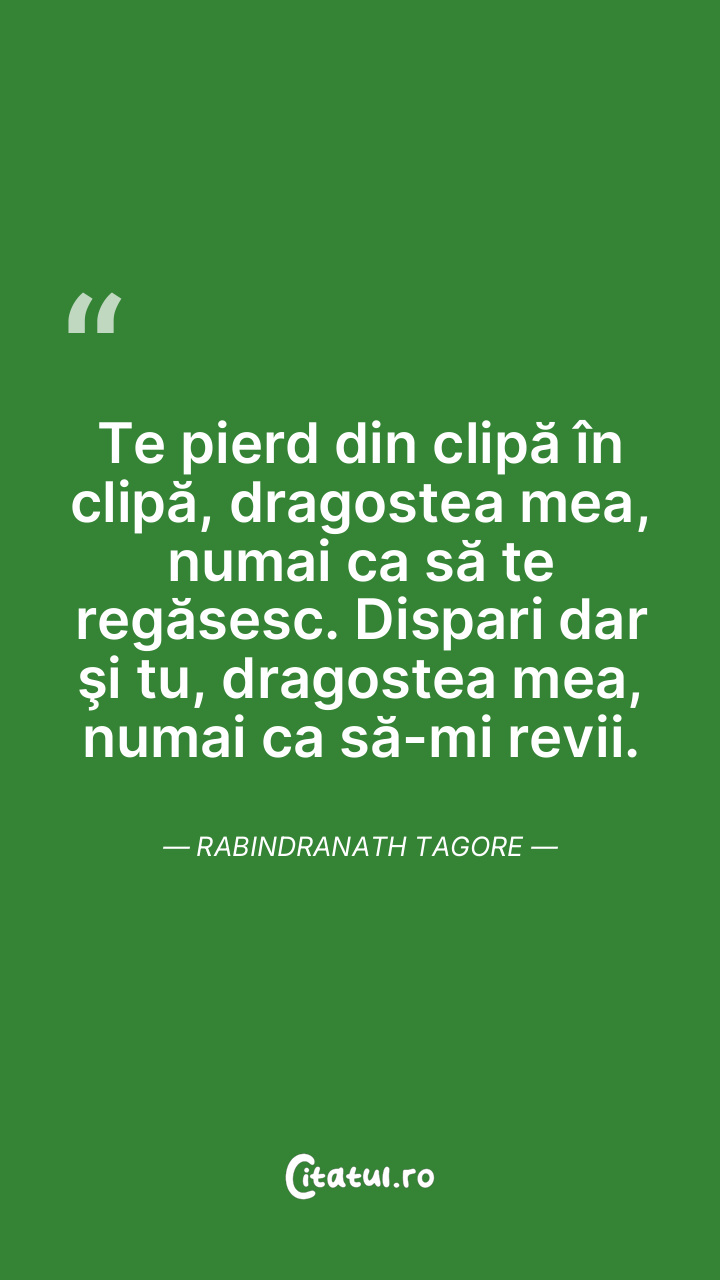 Te pierd din clipă în clipă, dragostea mea, numai ca să te regăsesc. Dispari dar şi tu, dragostea mea, numai ca să-mi revii. Rabindranath Tagore