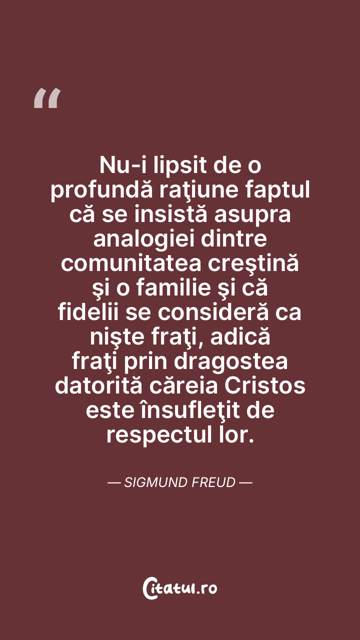 Nu-i lipsit de o profundă raţiune faptul că se insistă asupra analogiei dintre comunitatea creştină şi o familie şi că fidelii se consideră ca nişte fraţi, adică fraţi prin dragostea datorită căreia Cristos este însufleţit de respectul lor. Sigmund Freud