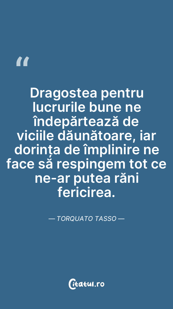 Dragostea pentru lucrurile bune ne îndepărtează de viciile dăunătoare, iar dorința de împlinire ne face să respingem tot ce ne-ar putea răni fericirea. Torquato Tasso