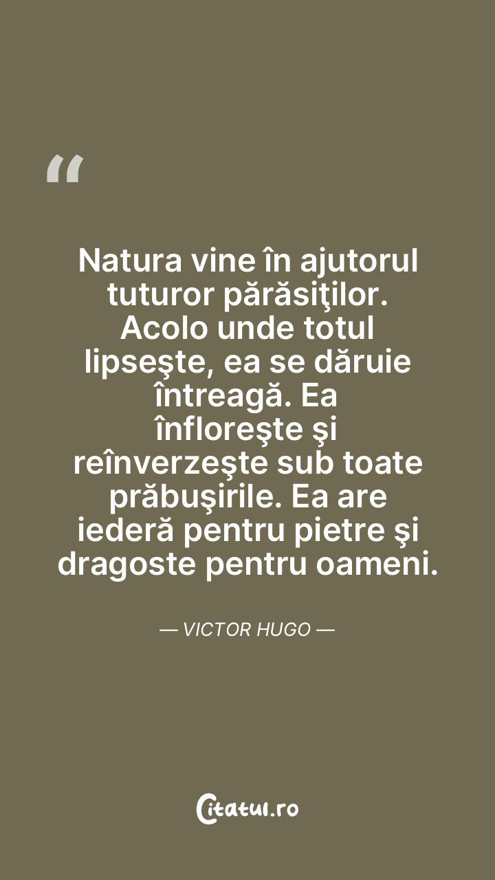 Natura vine în ajutorul tuturor părăsiţilor. Acolo unde totul lipseşte, ea se dăruie întreagă. Ea înfloreşte şi reînverzeşte sub toate prăbuşirile. Ea are iederă pentru pietre şi dragoste pentru oameni. Victor Hugo