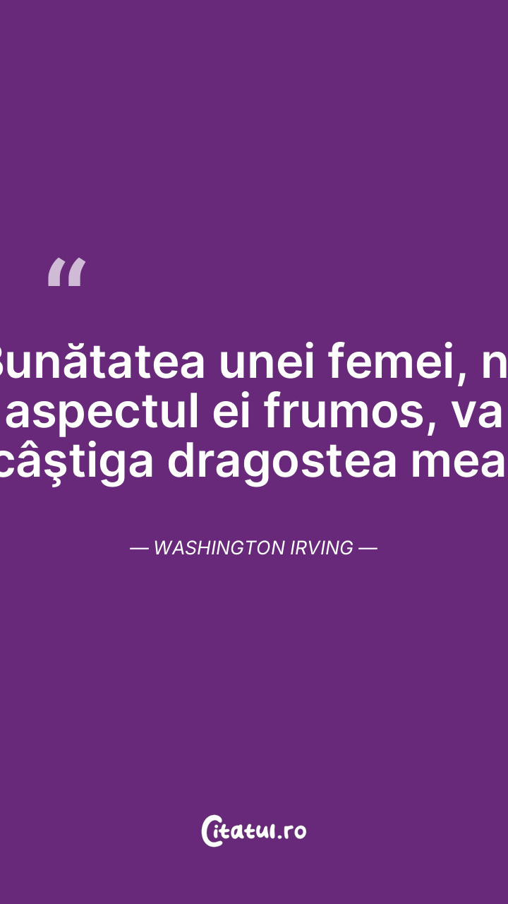 Bunătatea unei femei, nu aspectul ei frumos, va câştiga dragostea mea. Washington Irving