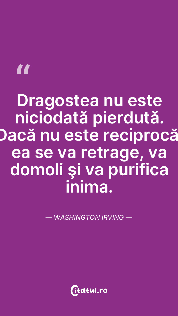Dragostea nu este niciodată pierdută. Dacă nu este reciprocă, ea se va retrage, va domoli şi va purifica inima. Washington Irving