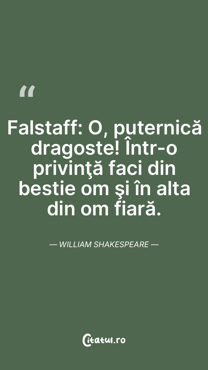 Falstaff: O, puternică dragoste! Într-o privinţă faci din bestie om şi în alta din om fiară. William Shakespeare