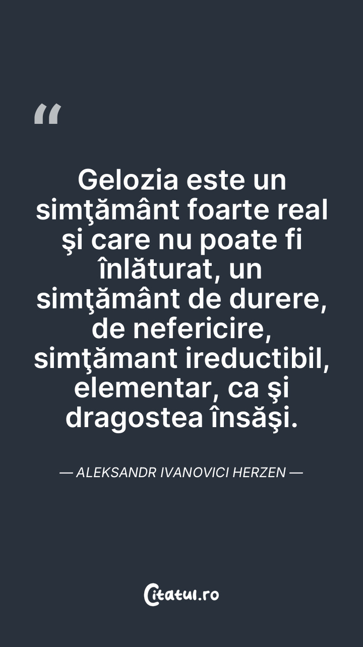 Gelozia este un simţământ foarte real şi care nu poate fi înlăturat, un simţământ de durere, de nefericire, simţămant ireductibil, elementar, ca şi dragostea însăşi. Aleksandr Ivanovici Herzen