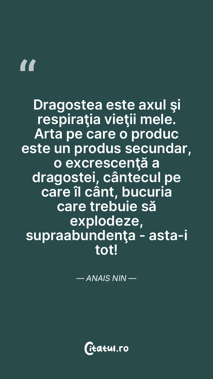 Dragostea este axul şi respiraţia vieţii mele. Arta pe care o produc este un produs secundar, o excrescenţă a dragostei, cântecul pe care îl cânt, bucuria care trebuie să explodeze, supraabundenţa - asta-i tot! Anais Nin