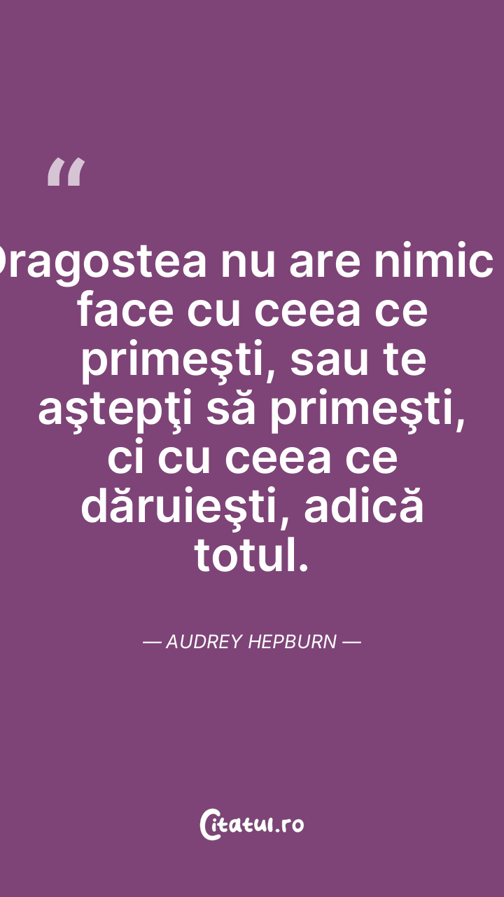 Dragostea nu are nimic a face cu ceea ce primeşti, sau te aştepţi să primeşti, ci cu ceea ce dăruieşti, adică totul. Audrey Hepburn