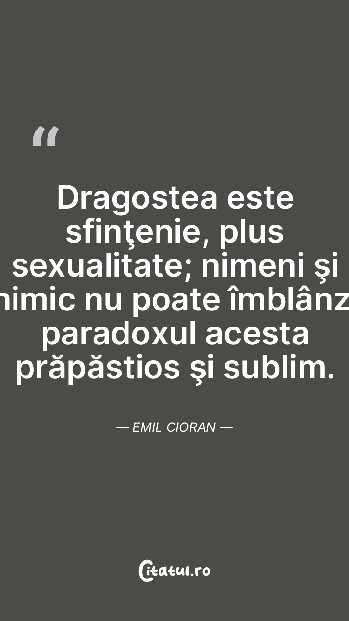 Dragostea este sfinţenie, plus sexualitate; nimeni şi nimic nu poate îmblânzi paradoxul acesta prăpăstios şi sublim. Emil Cioran