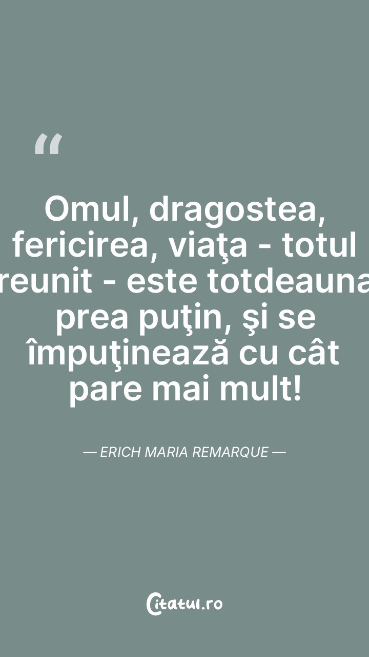 Omul, dragostea, fericirea, viaţa - totul reunit - este totdeauna prea puţin, şi se împuţinează cu cât pare mai mult! Erich Maria Remarque
