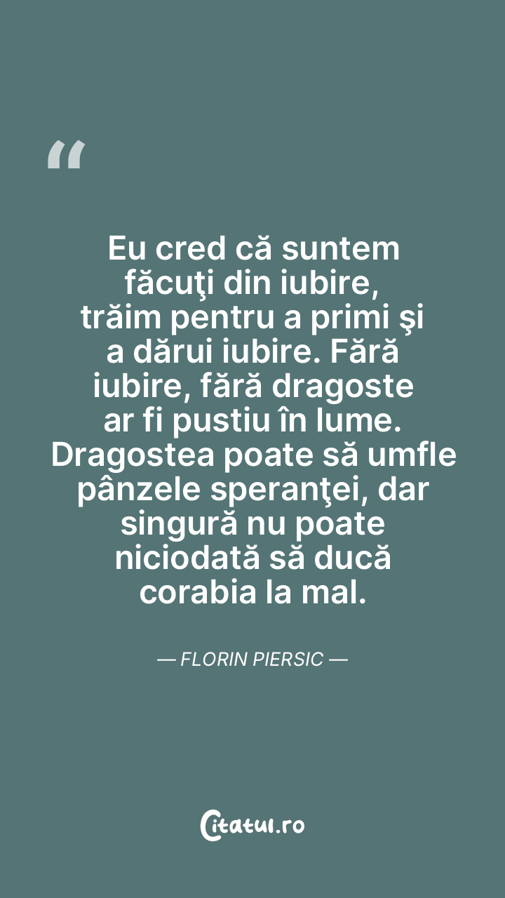 Eu cred că suntem făcuţi din iubire, trăim pentru a primi şi a dărui iubire. Fără iubire, fără dragoste ar fi pustiu în lume. Dragostea poate să umfle pânzele speranţei, dar singură nu poate niciodată să ducă corabia la mal. Florin Piersic