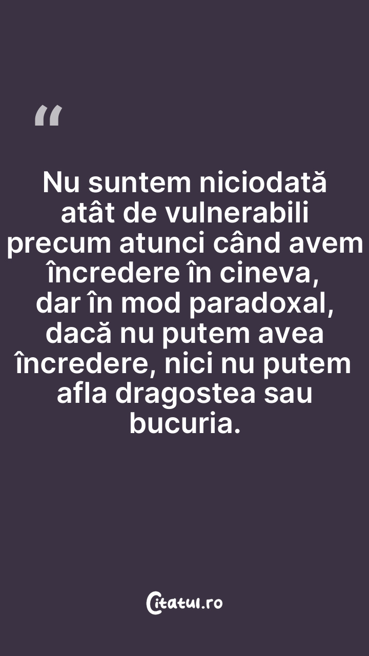 Nu suntem niciodată atât de vulnerabili precum atunci când avem încredere în cineva, dar în mod paradoxal, dacă nu putem avea încredere, nici nu putem afla dragostea sau bucuria.