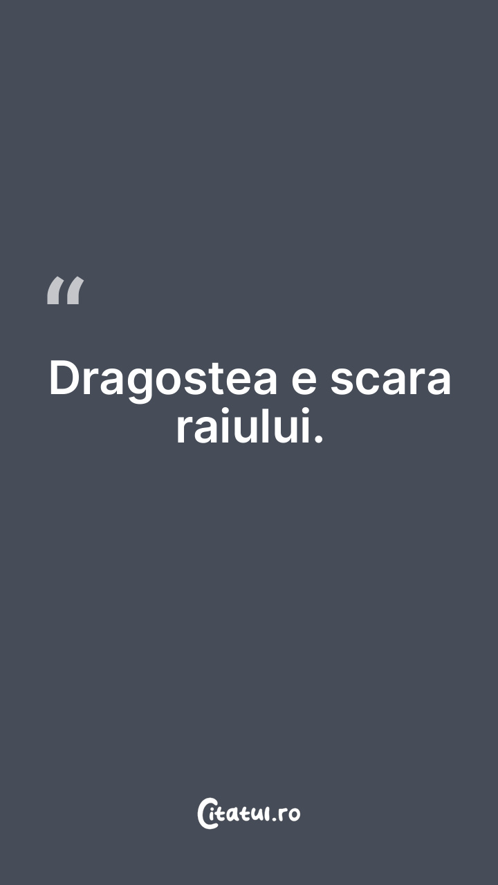 Dragostea e scara raiului. ... Categorie: citate dragoste Dificultate: Foarte ușor de citit! Votează: ★ ★ ★ ★ ★ (0/5 din 0) Distribuiți acest citat? Alegeți platforma preferată: Salvează citatul in telefon/pc Dragostea e scara raiului. Copiază Favorite Eroare