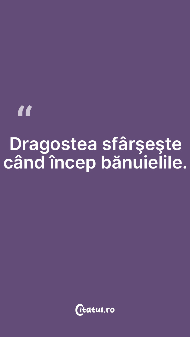 Dragostea sfârşeşte când încep bănuielile. ... Categorie: citate dragoste Dificultate: Ușor de citit și înțeles Votează: ★ ★ ★ ★ ★ (0/5 din 0) Distribuiți acest citat? Alegeți platforma preferată: Salvează citatul in telefon/pc Dragostea sfârşeşte când încep bănuielile. Copiază Favorite Eroare