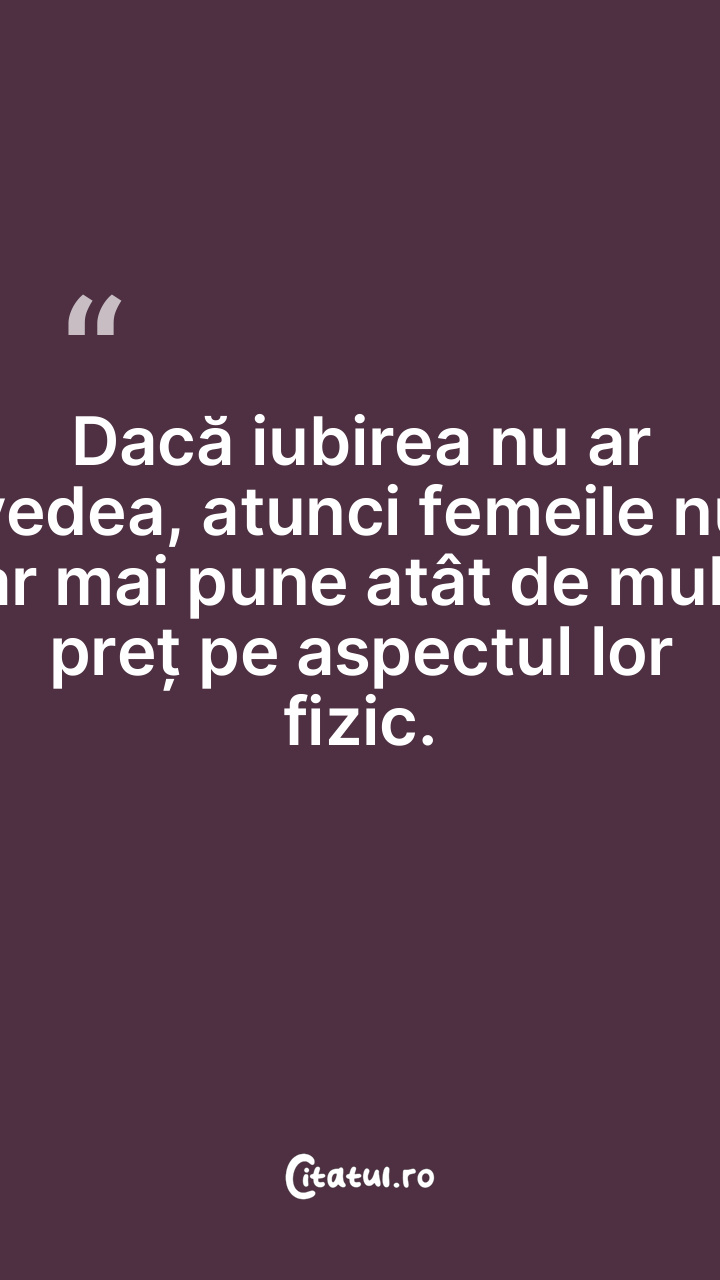 Dacă iubirea nu ar vedea, atunci femeile nu ar mai pune atât de mult preț pe aspectul lor fizic.