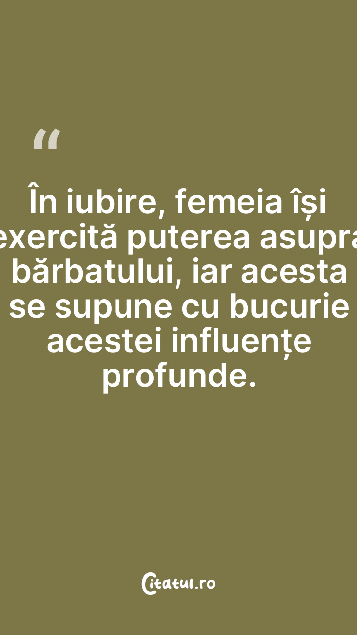 În iubire, femeia își exercită puterea asupra bărbatului, iar acesta se supune cu bucurie acestei influențe profunde.