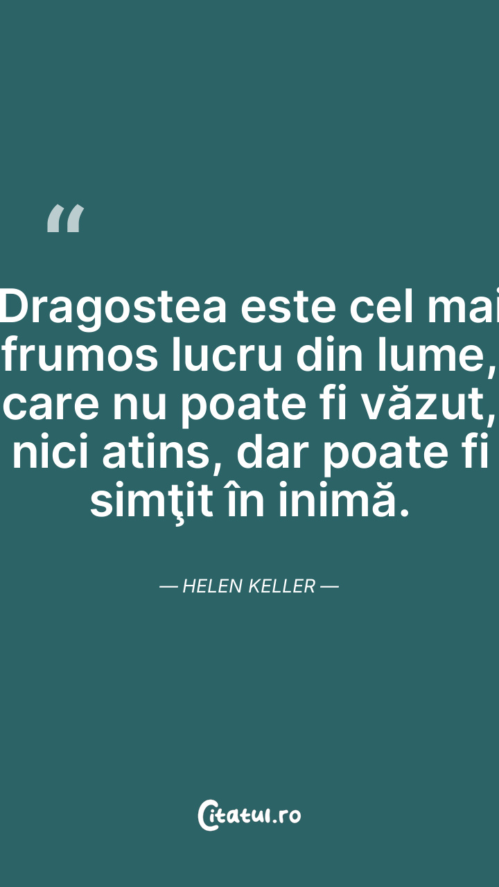 Dragostea este cel mai frumos lucru din lume, care nu poate fi văzut, nici atins, dar poate fi simţit în inimă. Helen Keller