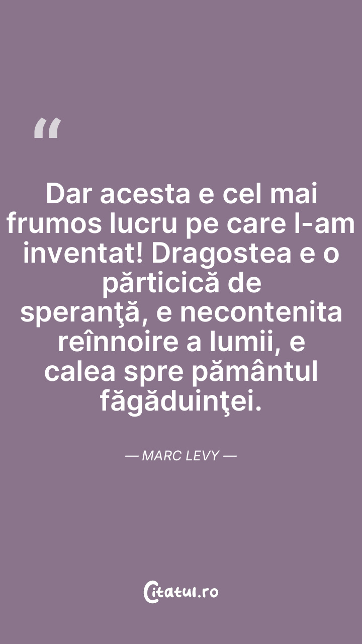 Dar acesta e cel mai frumos lucru pe care l-am inventat! Dragostea e o părticică de speranţă, e necontenita reînnoire a lumii, e calea spre pământul făgăduinţei. Marc Levy