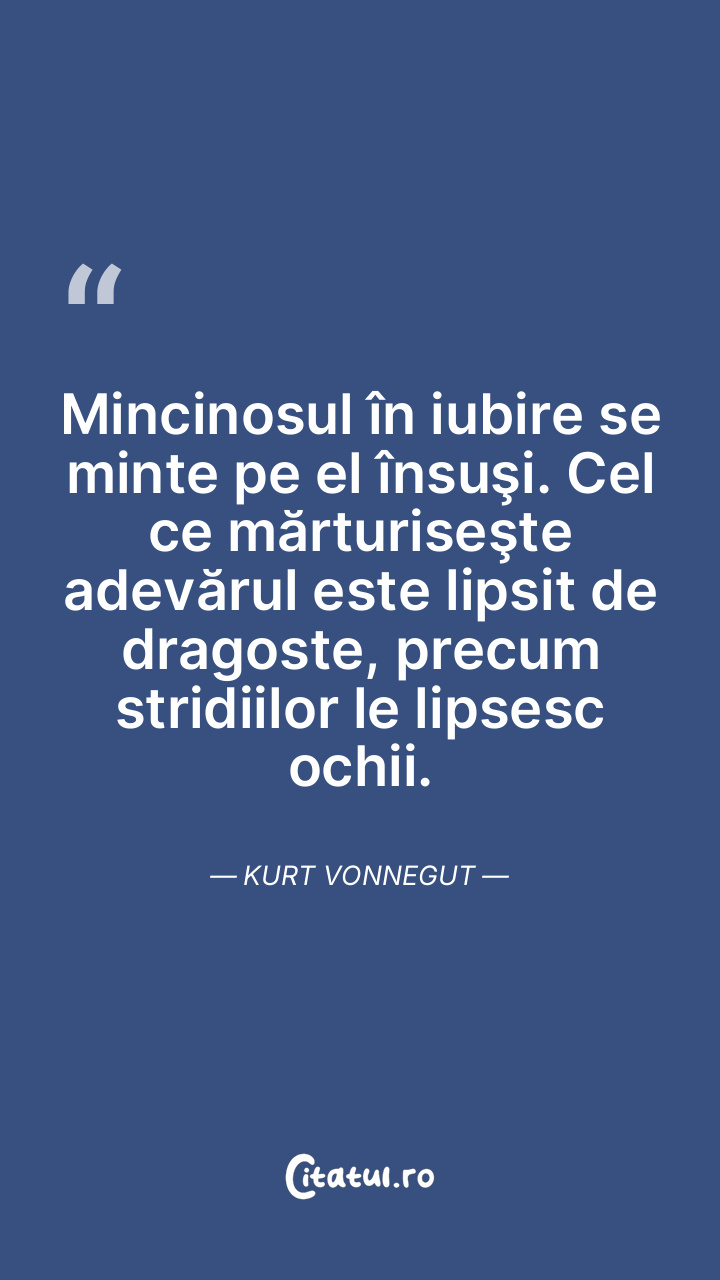 Mincinosul în iubire se minte pe el însuşi. Cel ce mărturiseşte adevărul este lipsit de dragoste, precum stridiilor le lipsesc ochii. Kurt Vonnegut