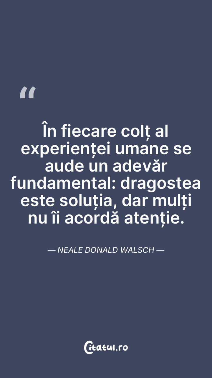 În fiecare colț al experienței umane se aude un adevăr fundamental: dragostea este soluția, dar mulți nu îi acordă atenție. Neale Donald Walsch