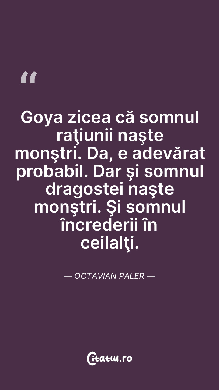 Goya zicea că somnul raţiunii naşte monştri. Da, e adevărat probabil. Dar şi somnul dragostei naşte monştri. Şi somnul încrederii în ceilalţi. Octavian Paler