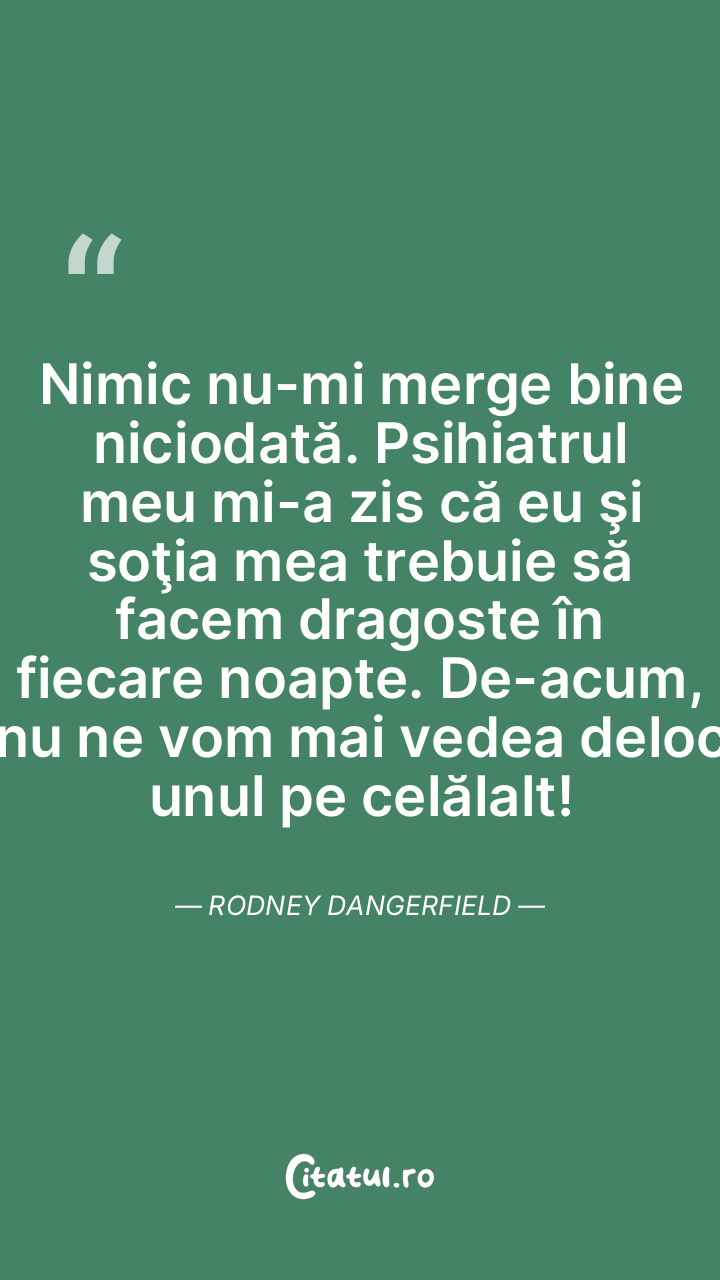 Nimic nu-mi merge bine niciodată. Psihiatrul meu mi-a zis că eu şi soţia mea trebuie să facem dragoste în fiecare noapte. De-acum, nu ne vom mai vedea deloc unul pe celălalt! Rodney Dangerfield