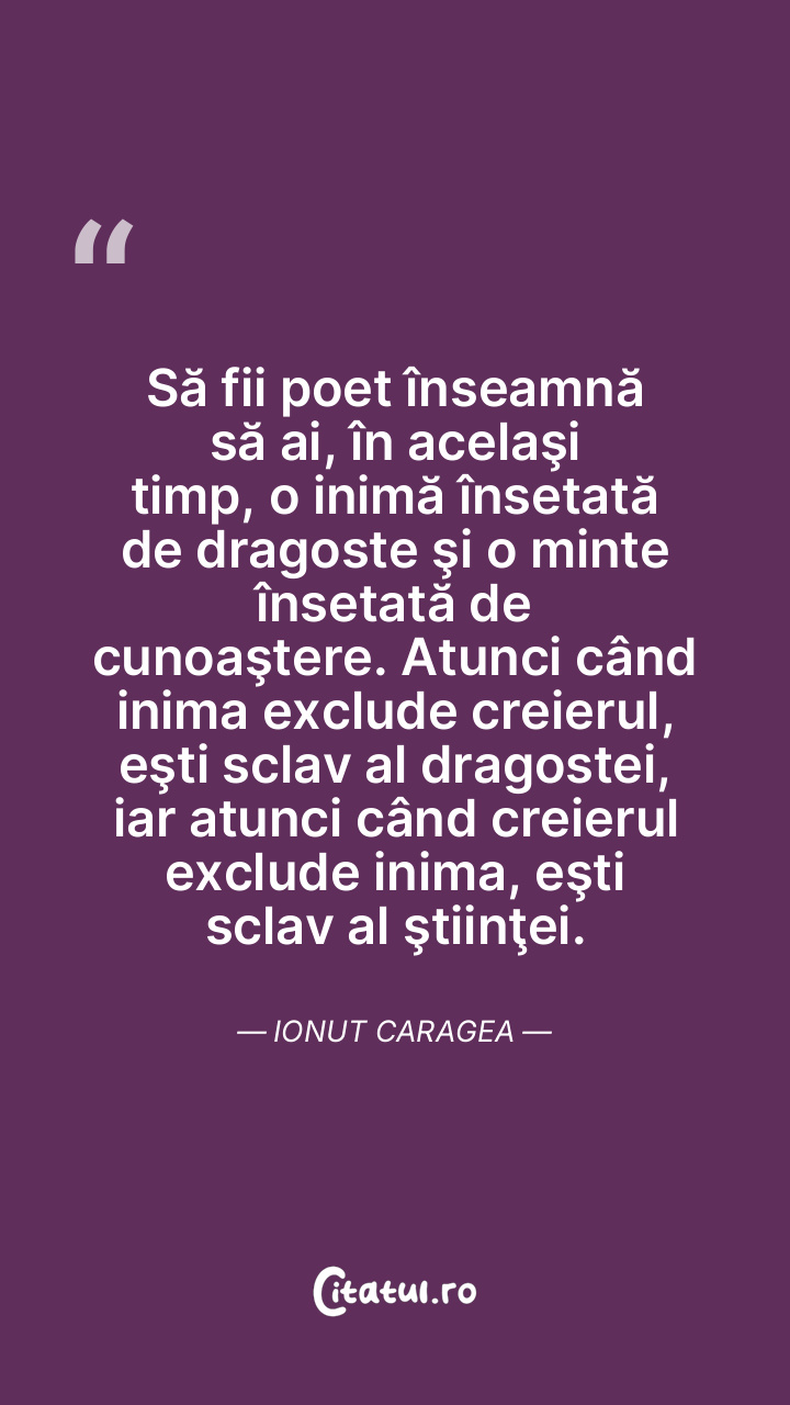 Să fii poet înseamnă să ai, în acelaşi timp, o inimă însetată de dragoste şi o minte însetată de cunoaştere. Atunci când inima exclude creierul, eşti sclav al dragostei, iar atunci când creierul exclude inima, eşti sclav al ştiinţei. Ionut Caragea