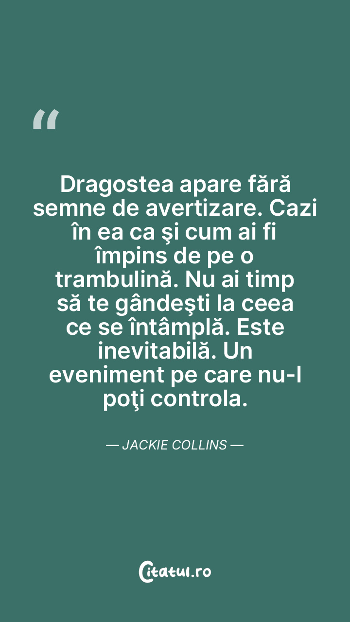 Dragostea apare fără semne de avertizare. Cazi în ea ca şi cum ai fi împins de pe o trambulină. Nu ai timp să te gândeşti la ceea ce se întâmplă. Este inevitabilă. Un eveniment pe care nu-l poţi controla. Jackie Collins