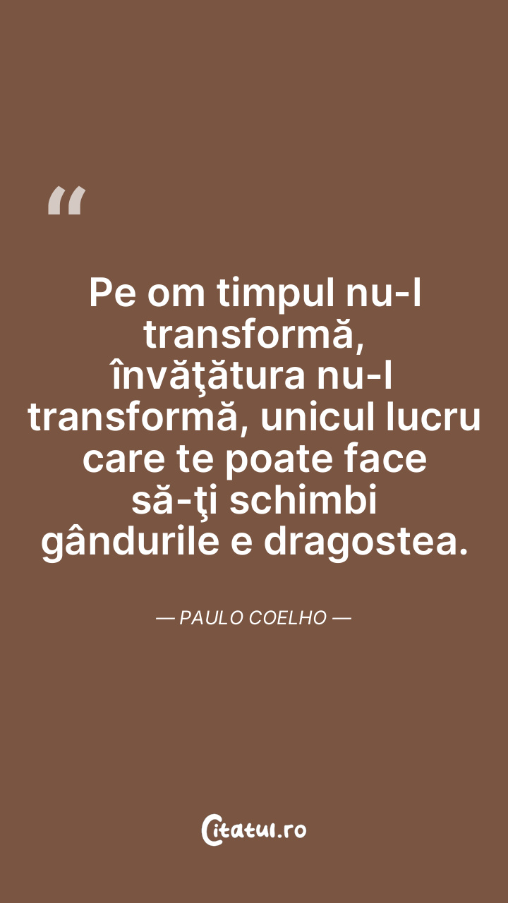 Pe om timpul nu-l transformă, învăţătura nu-l transformă, unicul lucru care te poate face să-ţi schimbi gândurile e dragostea. Paulo Coelho
