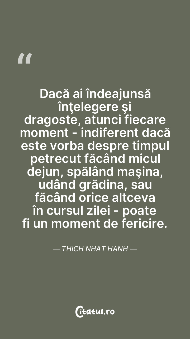 Dacă ai îndeajunsă înţelegere şi dragoste, atunci fiecare moment - indiferent dacă este vorba despre timpul petrecut făcând micul dejun, spălând maşina, udând grădina, sau făcând orice altceva în cursul zilei - poate fi un moment de fericire. Thich Nhat Hanh