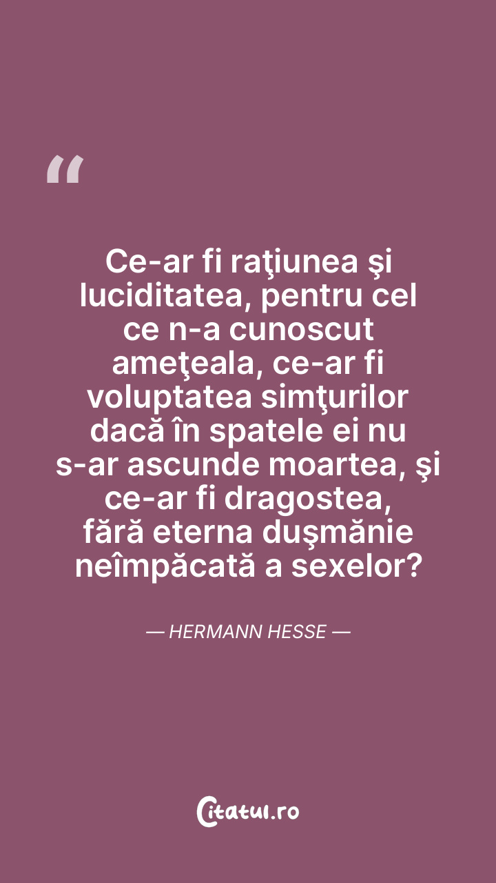 Ce-ar fi raţiunea şi luciditatea, pentru cel ce n-a cunoscut ameţeala, ce-ar fi voluptatea simţurilor dacă în spatele ei nu s-ar ascunde moartea, şi ce-ar fi dragostea, fără eterna duşmănie neîmpăcată a sexelor? Hermann Hesse