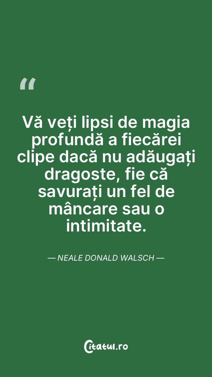 Vă veți lipsi de magia profundă a fiecărei clipe dacă nu adăugați dragoste, fie că savurați un fel de mâncare sau o intimitate. Neale Donald Walsch