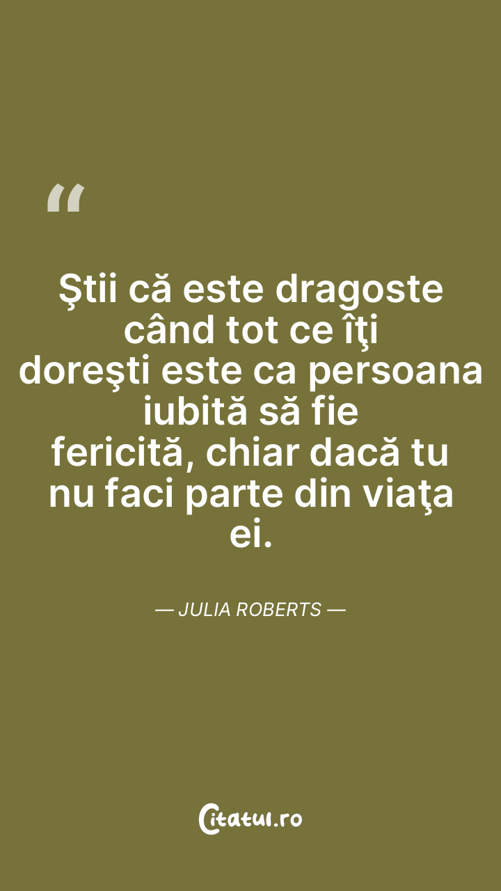 Ştii că este dragoste când tot ce îţi doreşti este ca persoana iubită să fie fericită, chiar dacă tu nu faci parte din viaţa ei. Julia Roberts