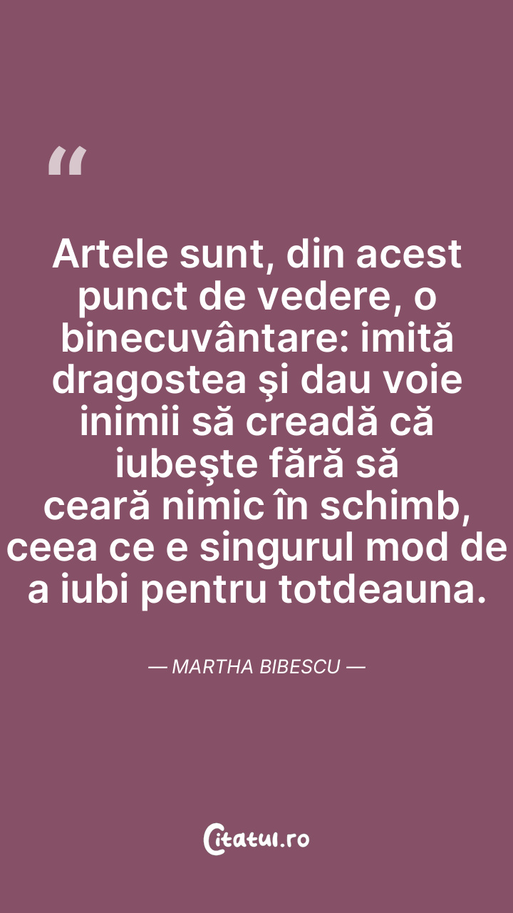 Artele sunt, din acest punct de vedere, o binecuvântare: imită dragostea şi dau voie inimii să creadă că iubeşte fără să ceară nimic în schimb, ceea ce e singurul mod de a iubi pentru totdeauna. Martha Bibescu