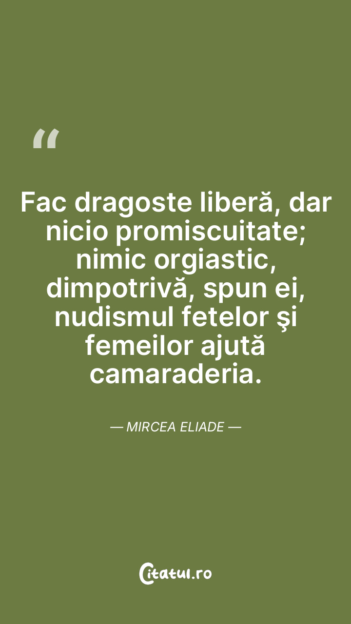 Fac dragoste liberă, dar nicio promiscuitate; nimic orgiastic, dimpotrivă, spun ei, nudismul fetelor şi femeilor ajută camaraderia. Mircea Eliade
