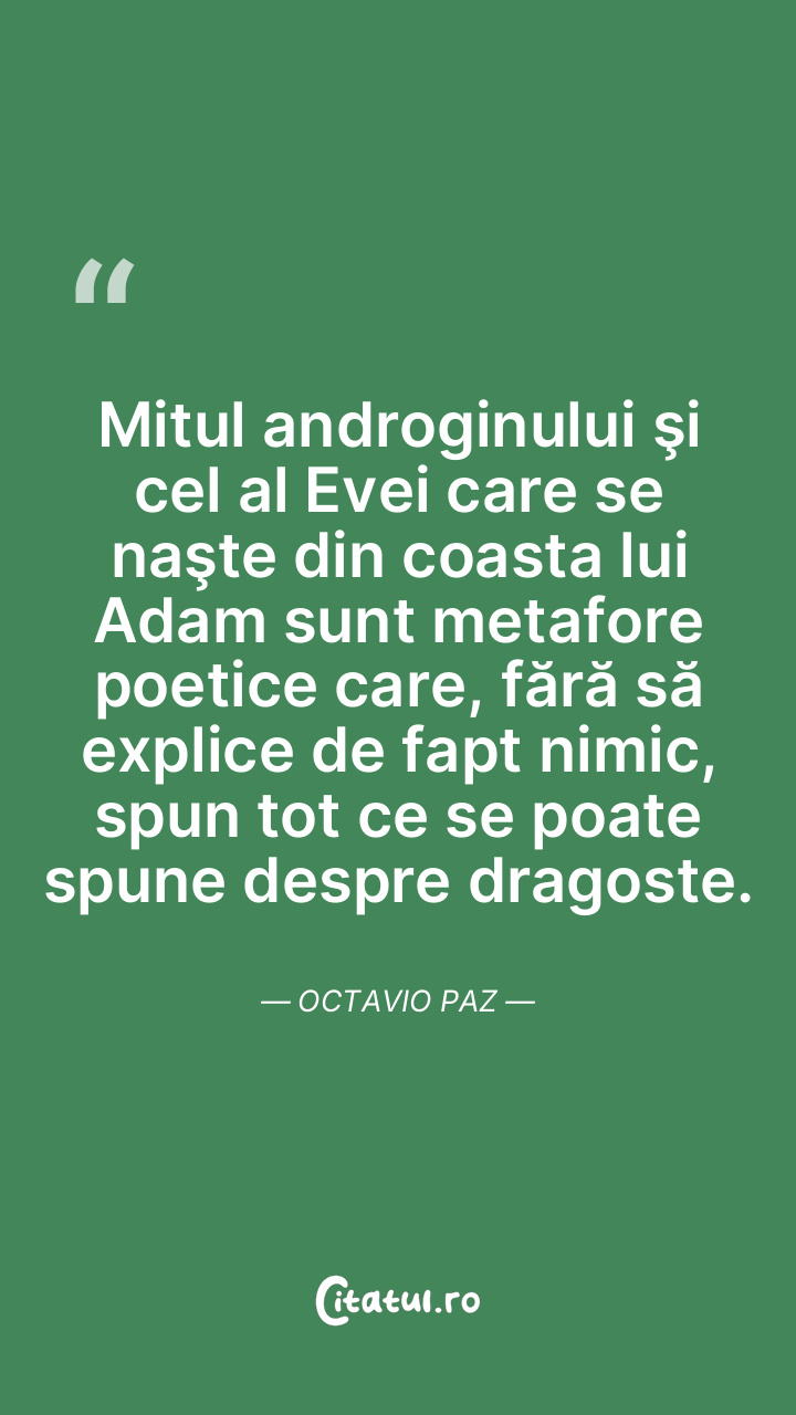 Mitul androginului şi cel al Evei care se naşte din coasta lui Adam sunt metafore poetice care, fără să explice de fapt nimic, spun tot ce se poate spune despre dragoste. Octavio Paz