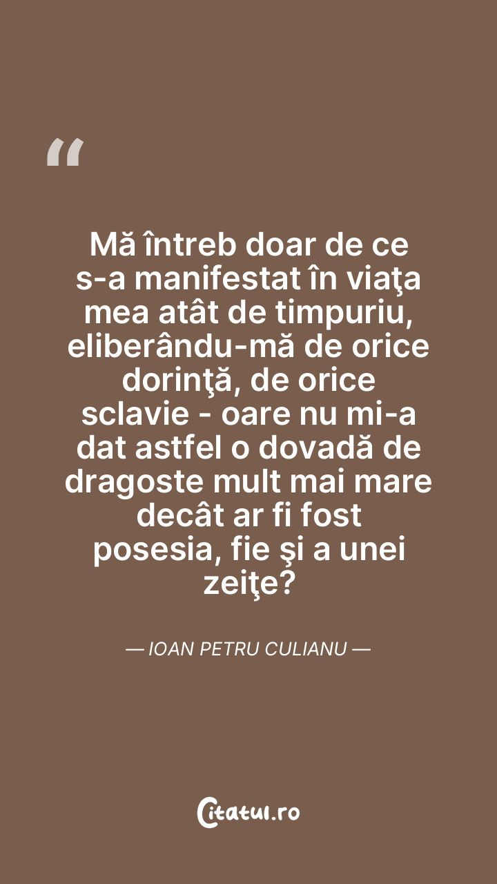 Mă întreb doar de ce s-a manifestat în viaţa mea atât de timpuriu, eliberându-mă de orice dorinţă, de orice sclavie - oare nu mi-a dat astfel o dovadă de dragoste mult mai mare decât ar fi fost posesia, fie şi a unei zeiţe? Ioan Petru Culianu