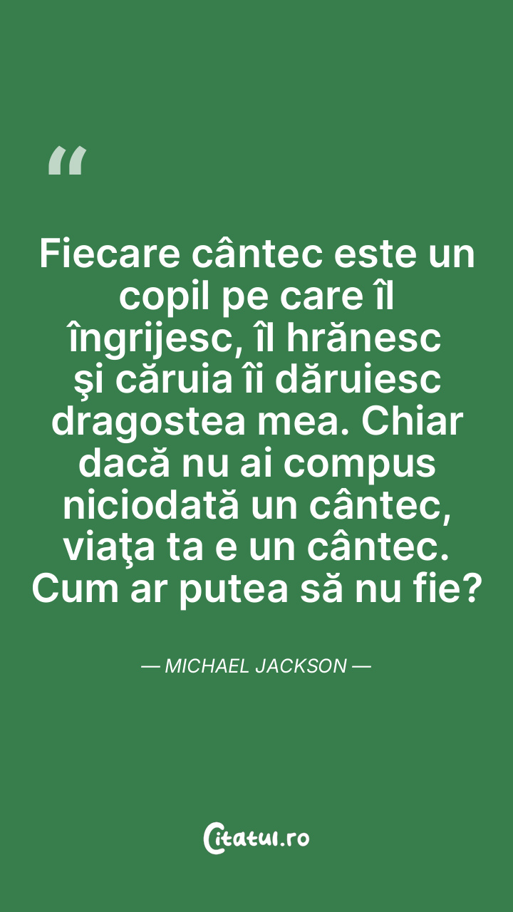 Fiecare cântec este un copil pe care îl îngrijesc, îl hrănesc şi căruia îi dăruiesc dragostea mea. Chiar dacă nu ai compus niciodată un cântec, viaţa ta e un cântec. Cum ar putea să nu fie? Michael Jackson