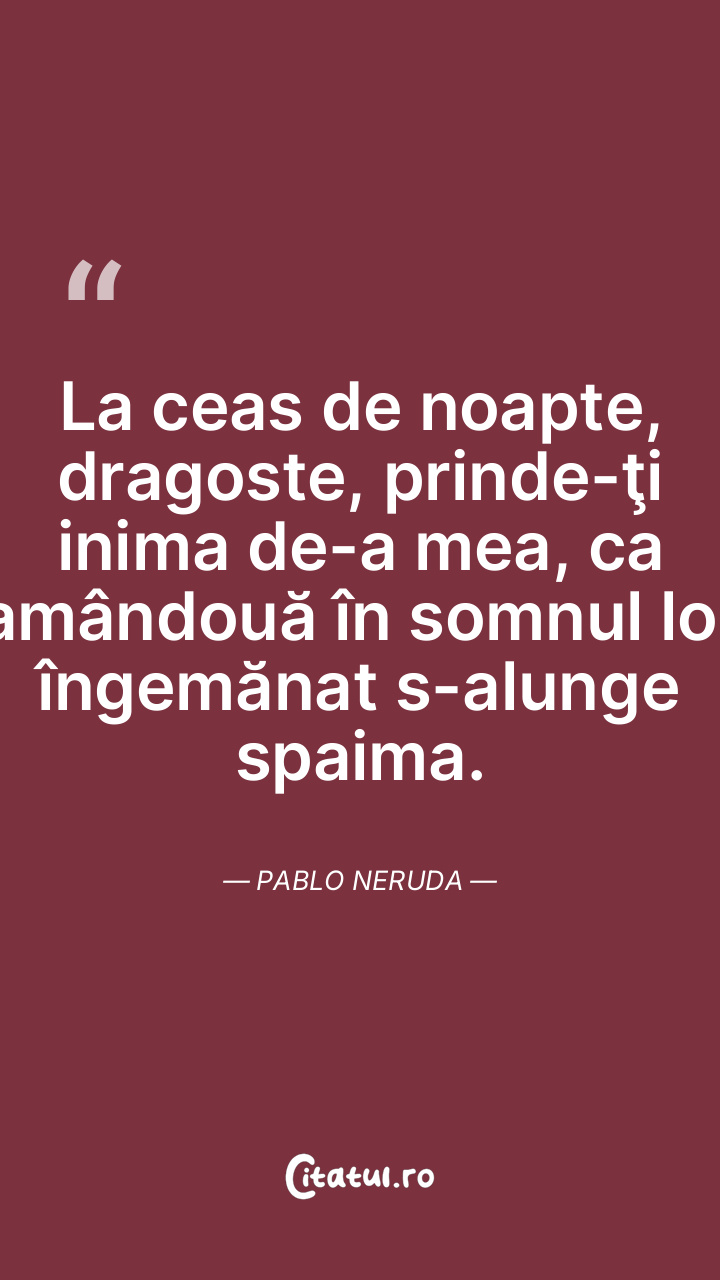 La ceas de noapte, dragoste, prinde-ţi inima de-a mea, ca amândouă în somnul lor îngemănat s-alunge spaima. Pablo Neruda